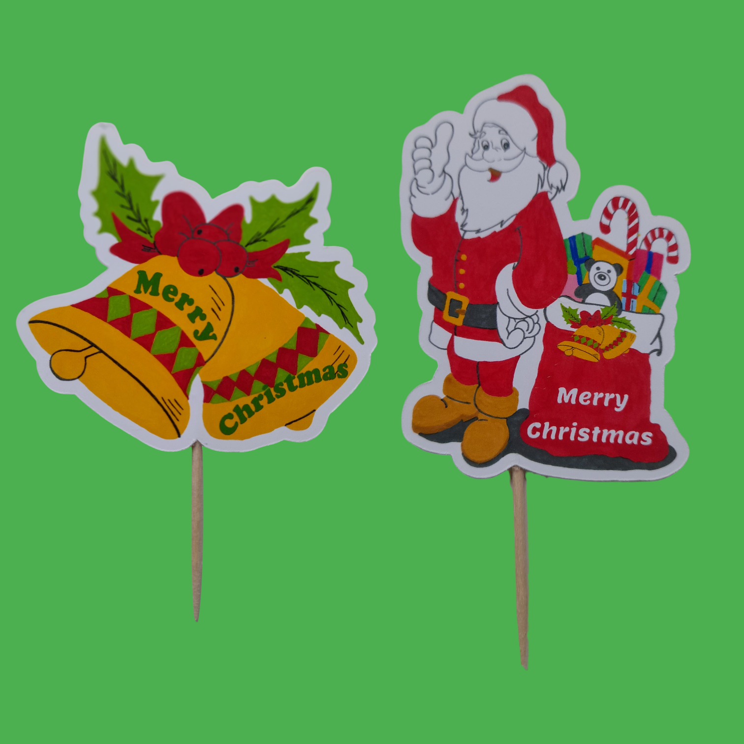 • Specifications - Each cup cake topper is supported with standard tooth pick and there are 20 cup cake toppers in the pack. The appearance of image is one sided and the wooden sticks used are of food grade. Santa cup cake topper is 10.5 cm x 5.5 cm & Jingle cup cake topper is 10.5 cm x 7 cm.